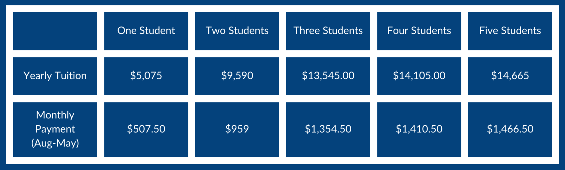 2026-2027 yearly tuition is $5,075. There is a discount for additional siblings. Each child after the third will be $560/ child. Tuition is what the school relies on to pay monthly financial responsibilities.
